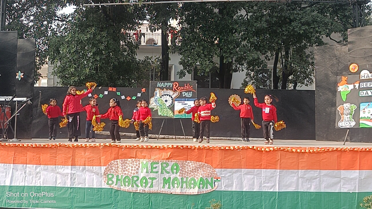 The school celebrated the 77th Republic Day with great pride, enthusiasm, and patriotic spirit. The presence of the Director, Mr. Sambhrant Sharma, added dignity and significance to the occasion. The programme commenced with the unfurling of the national flag by director sir and headmistress ma’am, followed by the National Anthem and an impressive march past by students. Various cultural performances were presented, including patriotic songs, articles, thoughts, poems, and dances that reflected the unity, diversity, and rich heritage of India. A special highlight of the celebration was the kindergarten performances, where young students mesmerized the audience with their energetic dances and melodious patriotic songs. Their confidence and joyful expressions were truly commendable. The programme concluded with a vote of thanks by the Headmistress Ms Gitika Kapoor, leaving everyone inspired and filled with national pride.