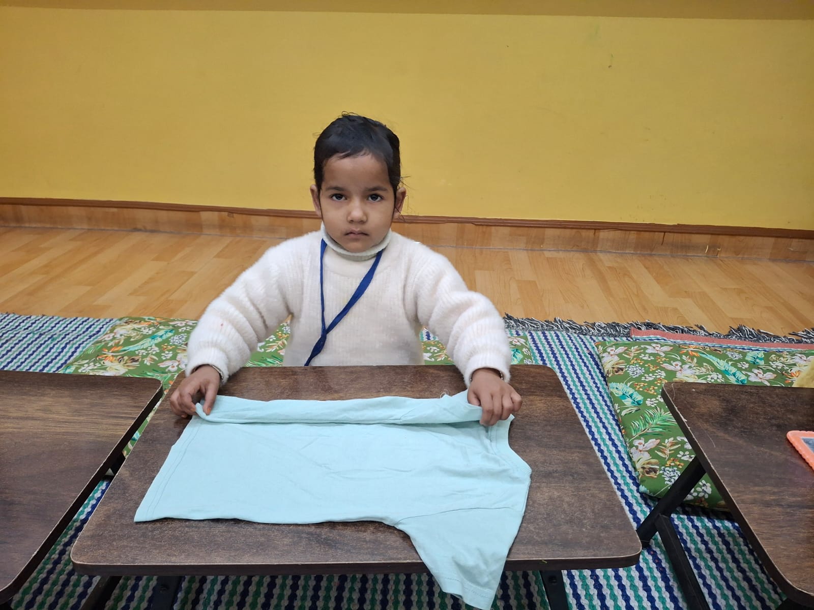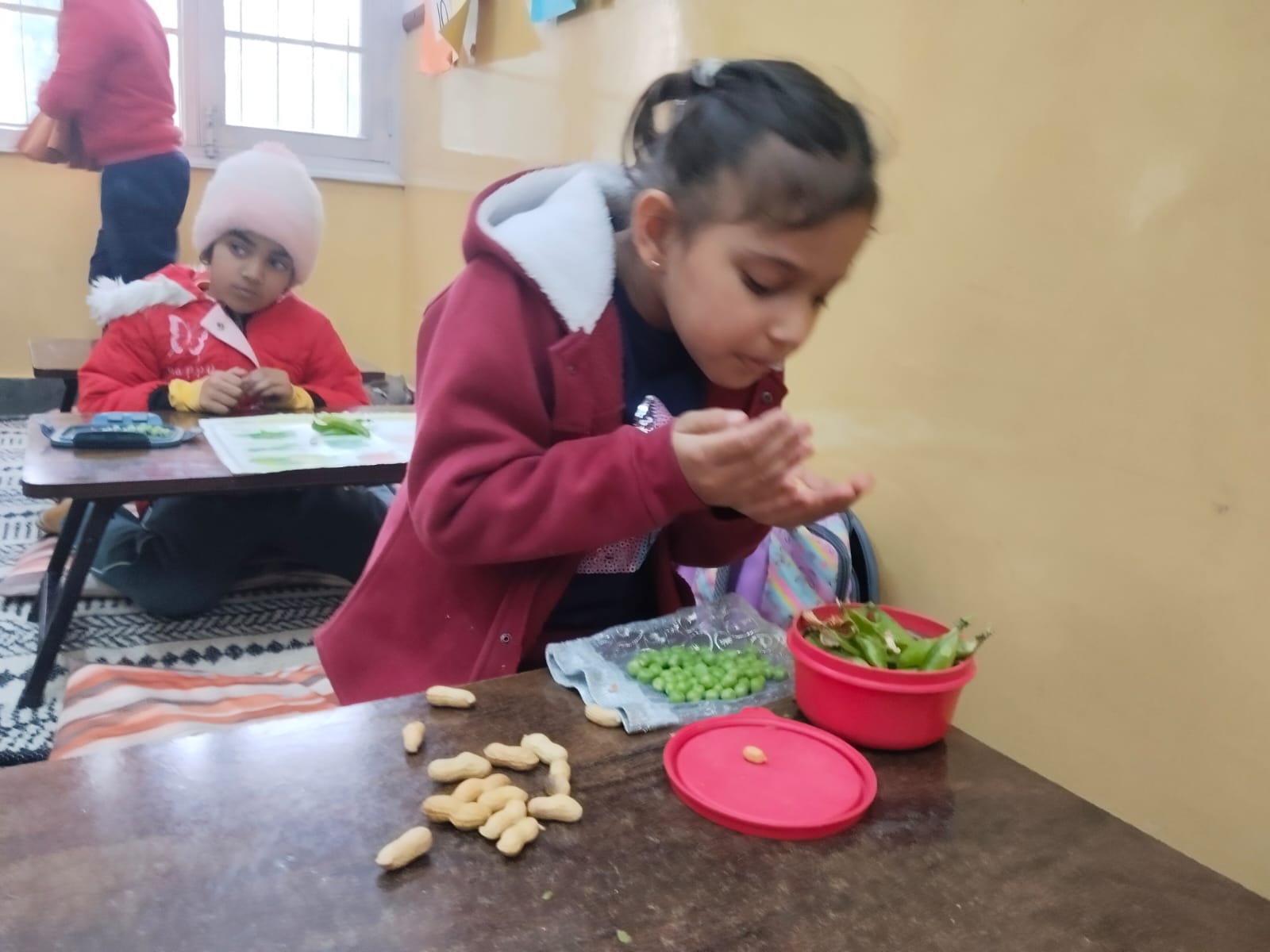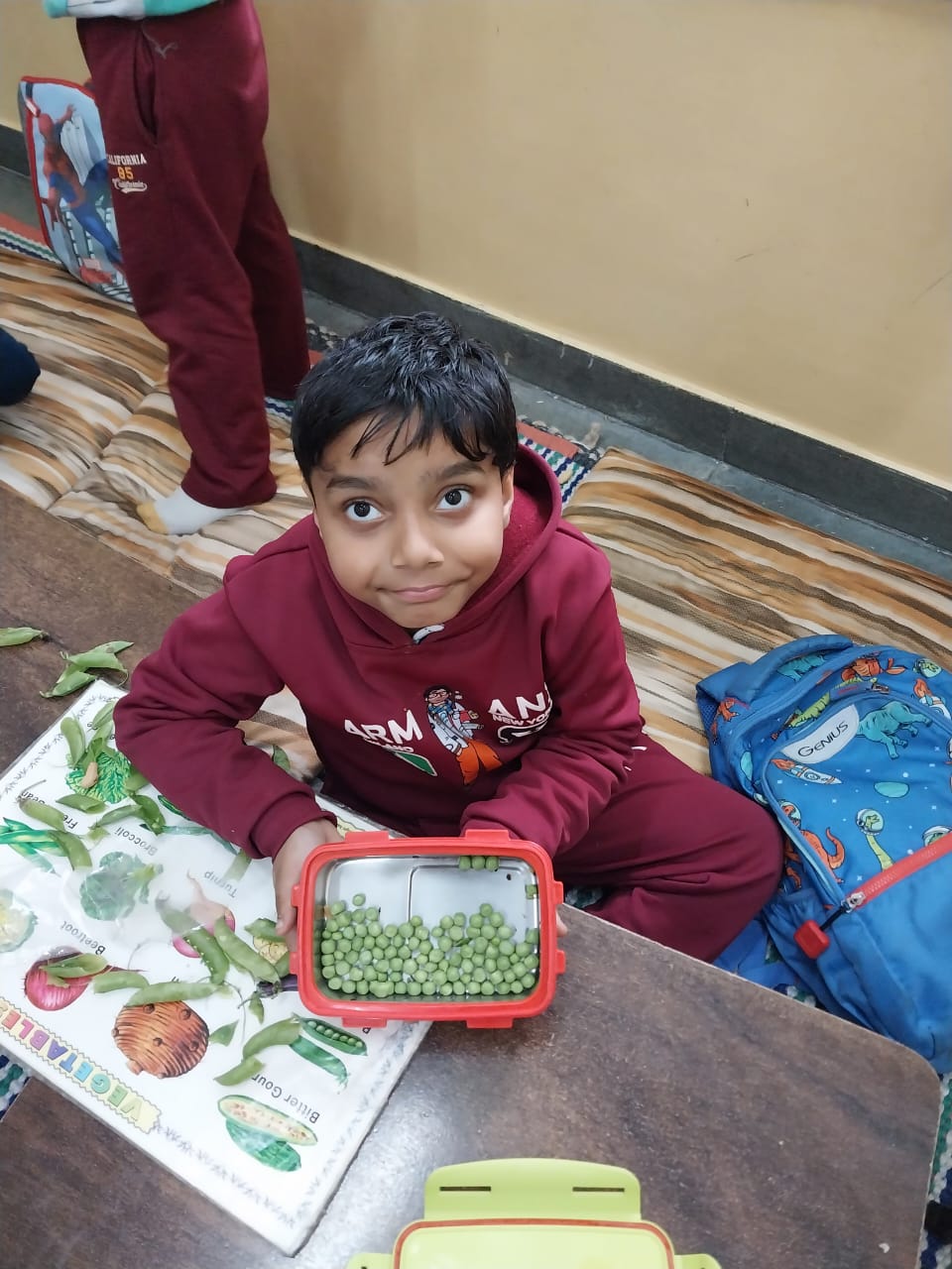 Kindergarten students actively participated in lifestyle-based activities such as backpack packing, T-shirt folding, and peeling peas/peanuts. The backpack activity helped students learn organization, while T-shirt folding improved fine motor skills and coordination. The peeling activity strengthened finger muscles and hand-eye coordination. Overall, children enjoyed the activities and showed active participation.