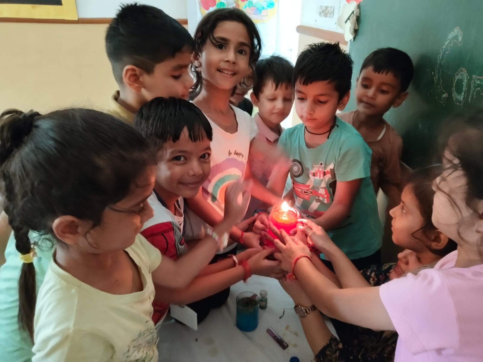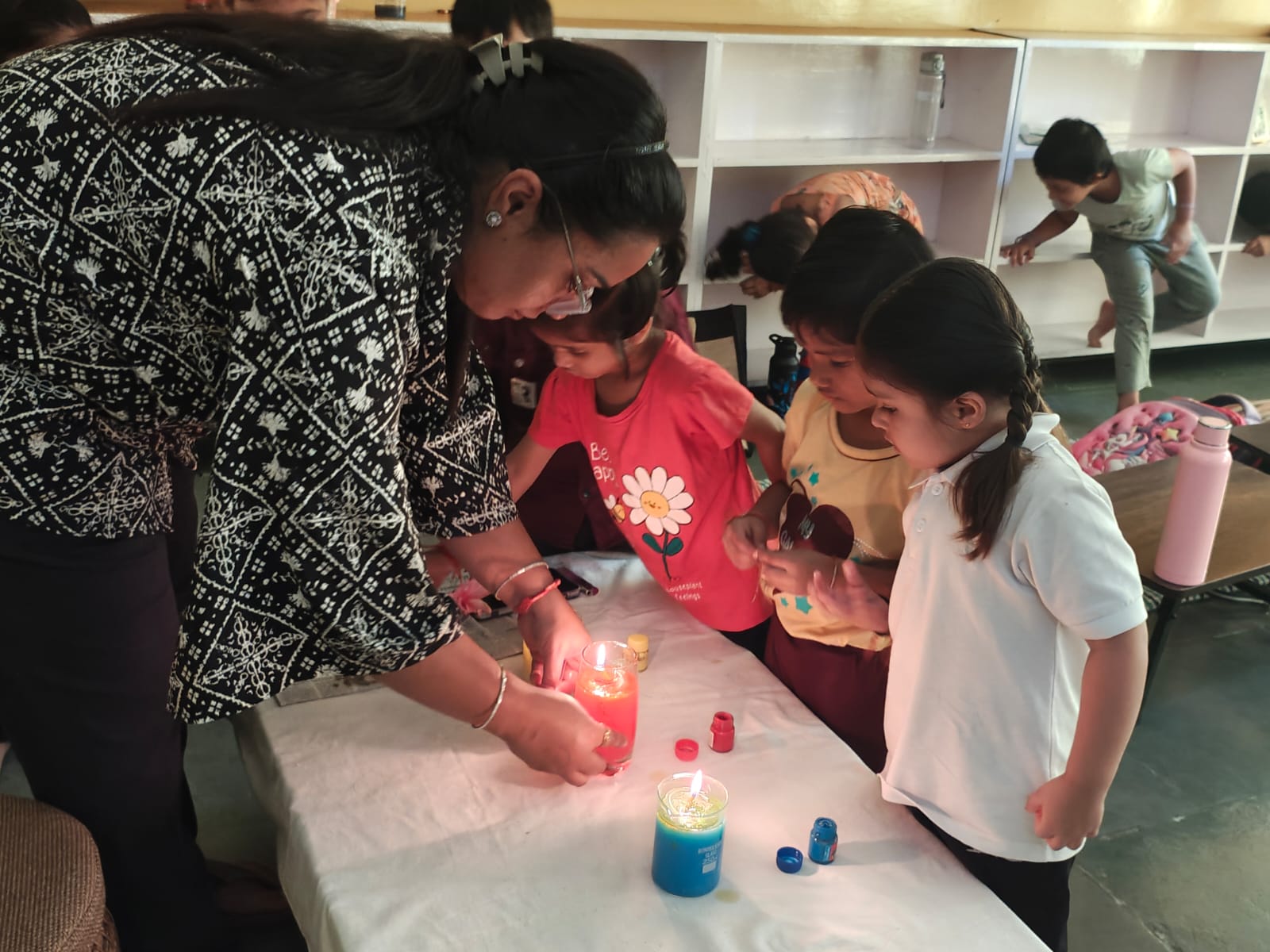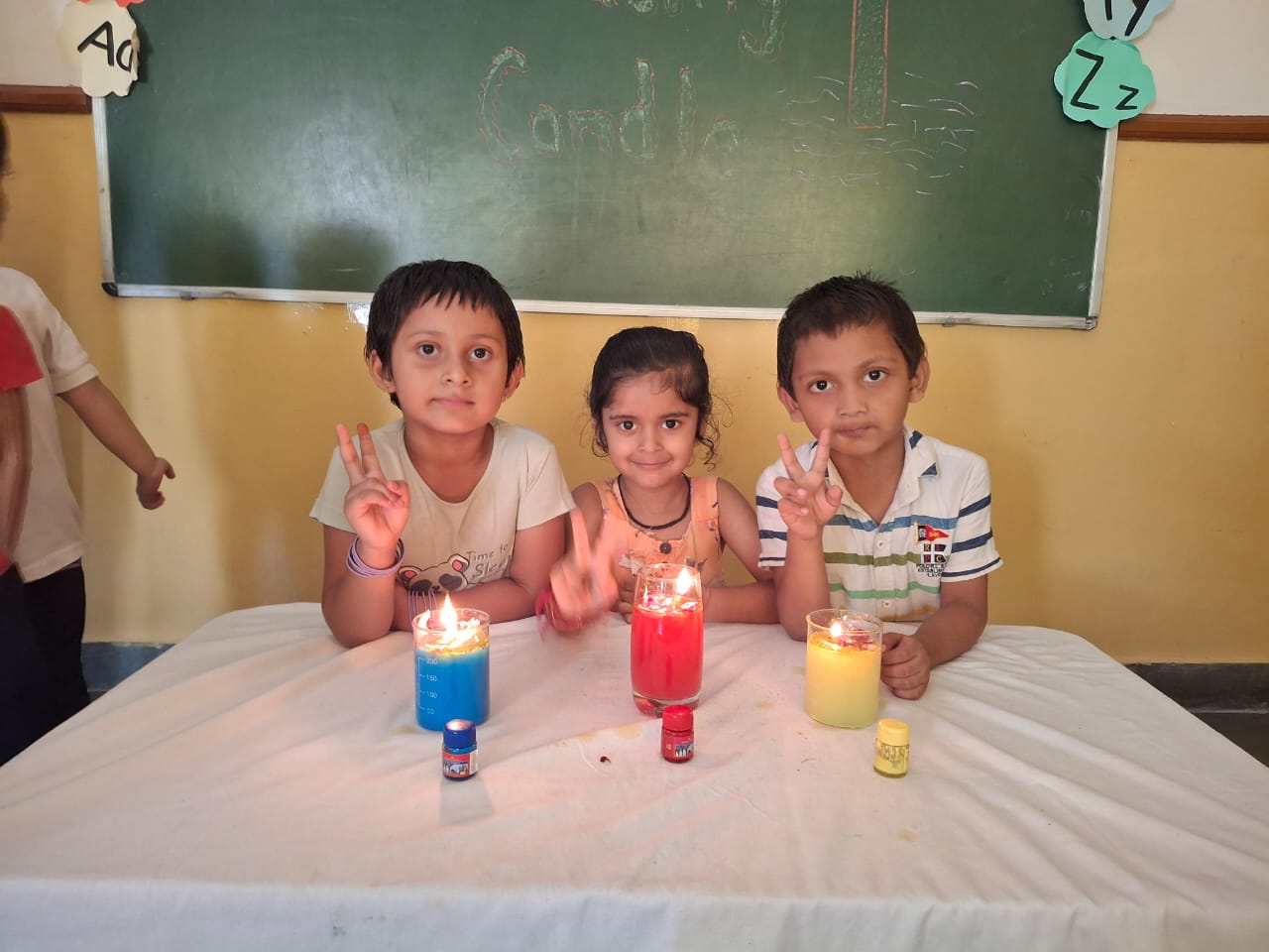 Our little learners explored a fun and creative way of making floating candles. The activity was conducted using a glass of water filled with a little mustard oil. The water was made colourful by adding paints like blue, red, and green. To make it more attractive, flower petals were also added for decoration.Cotton was placed in the glass and used as a wick. The experiment not only introduced the children to a simple scientific concept but also sparked their creativity. The young ones thoroughly enjoyed making their own floating candles and were thrilled to see the beautiful outcome.