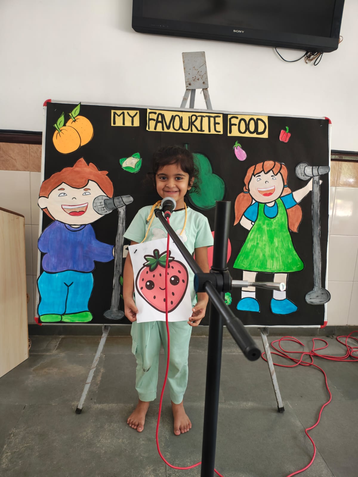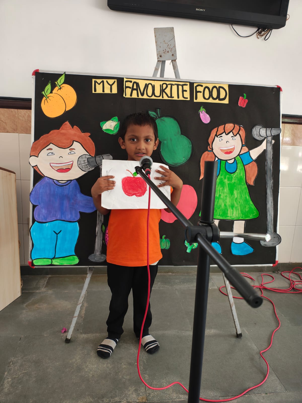 The activity not only enhanced their speaking skills but also helped them build confidence to express themselves in front of others. It was delightful to see the children sharing their favourite food choices so happily while proudly using their creative props. The session was a wonderful blend of learning and fun.