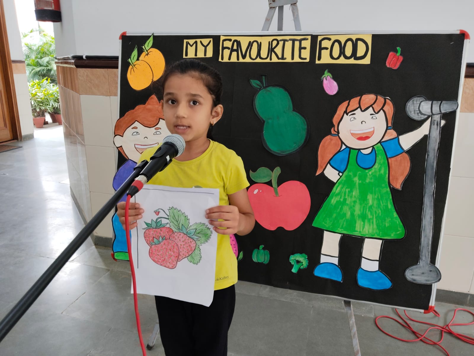 Today our kindergarten students participated in the Let’s Talk Activity on the topic “My Favourite Food.” The little ones confidently came forward and spoke a few lines about their favourite food items. To make the activity more exciting, children also brought beautifully prepared handmade props from home related to their favourite dishes. Each child expressed their thoughts with great enthusiasm and joy.