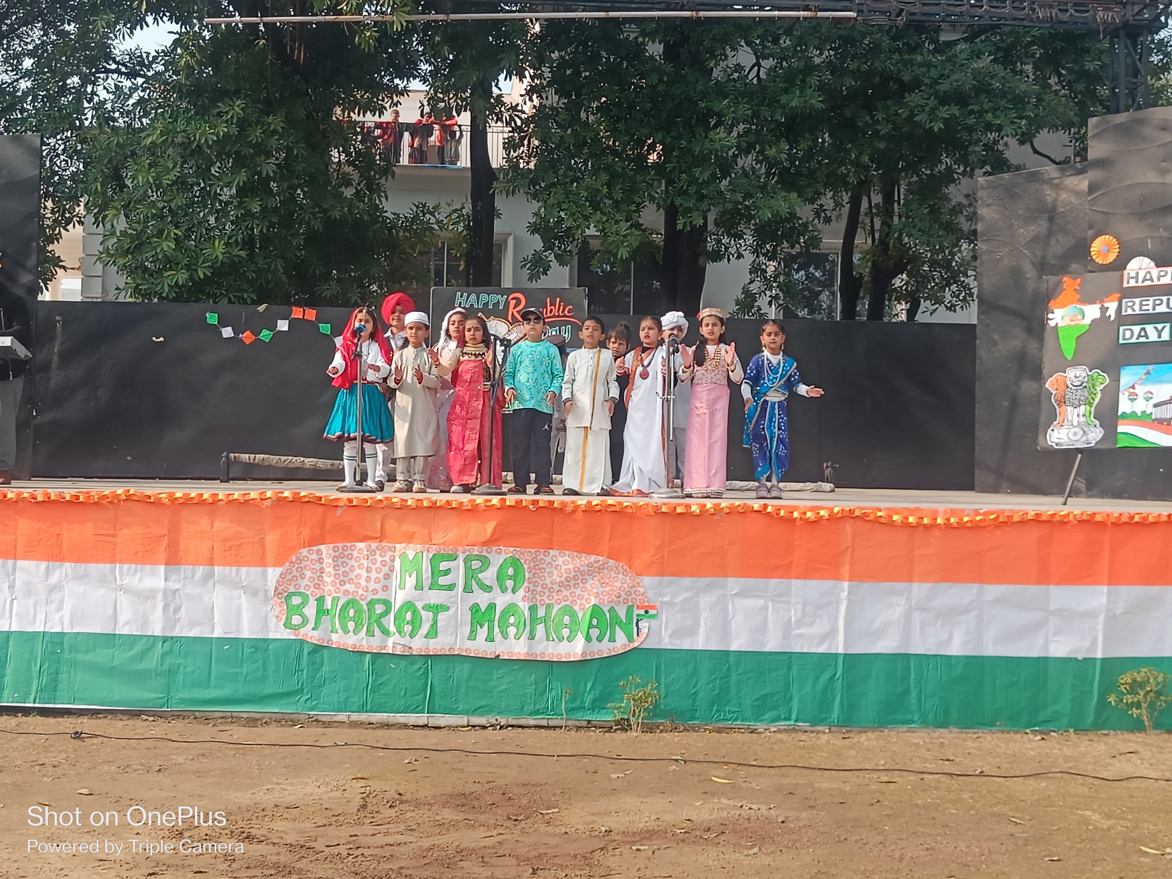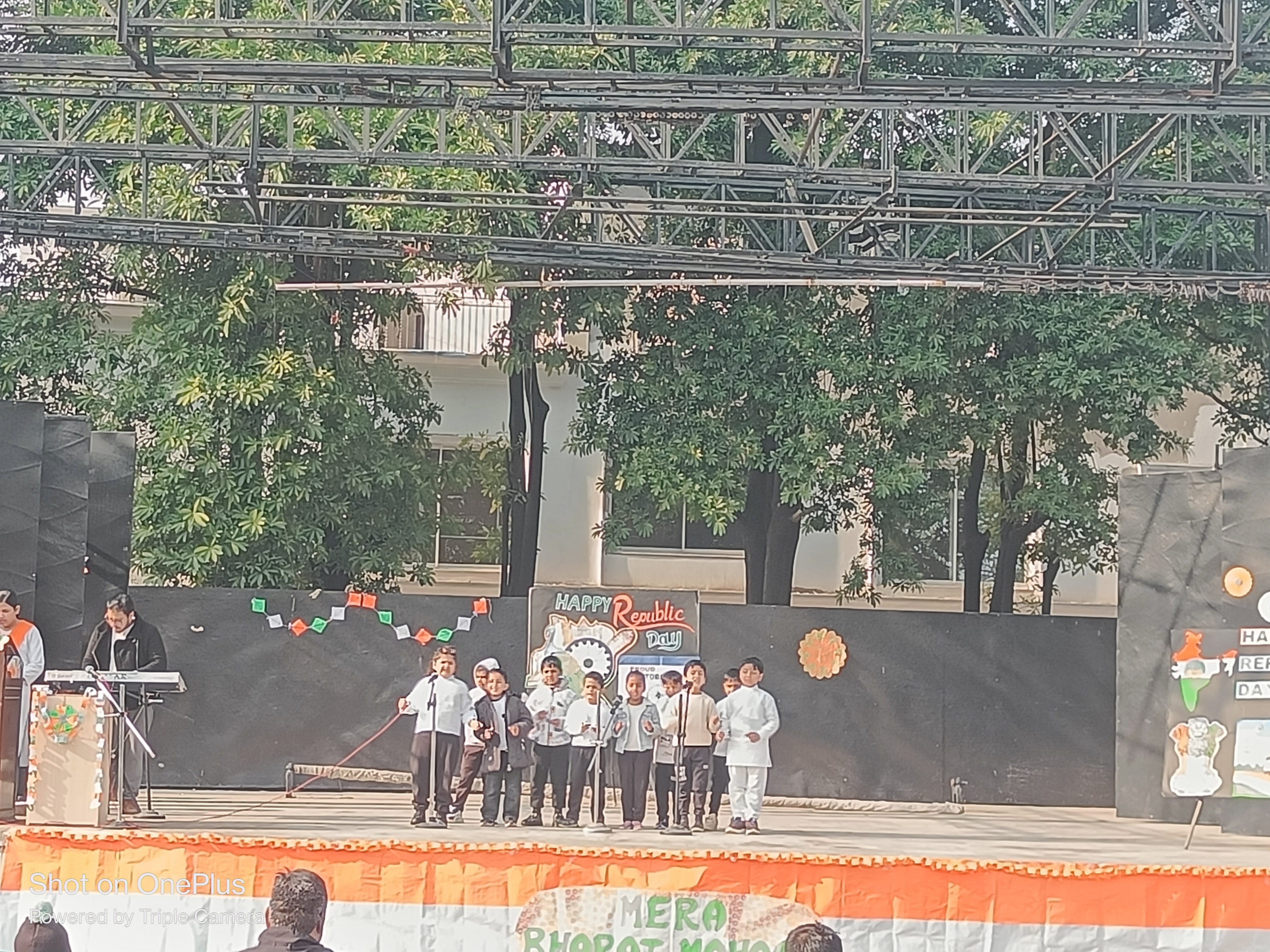 The school celebrated the 77th Republic Day with great pride, enthusiasm, and patriotic spirit. The presence of the Director, Mr. Sambhrant Sharma, added dignity and significance to the occasion. The programme commenced with the unfurling of the national flag by director sir and headmistress ma’am, followed by the National Anthem and an impressive march past by students. Various cultural performances were presented, including patriotic songs, articles, thoughts, poems, and dances that reflected the unity, diversity, and rich heritage of India. A special highlight of the celebration was the kindergarten performances, where young students mesmerized the audience with their energetic dances and melodious patriotic songs. Their confidence and joyful expressions were truly commendable. The programme concluded with a vote of thanks by the Headmistress Ms Gitika Kapoor, leaving everyone inspired and filled with national pride.