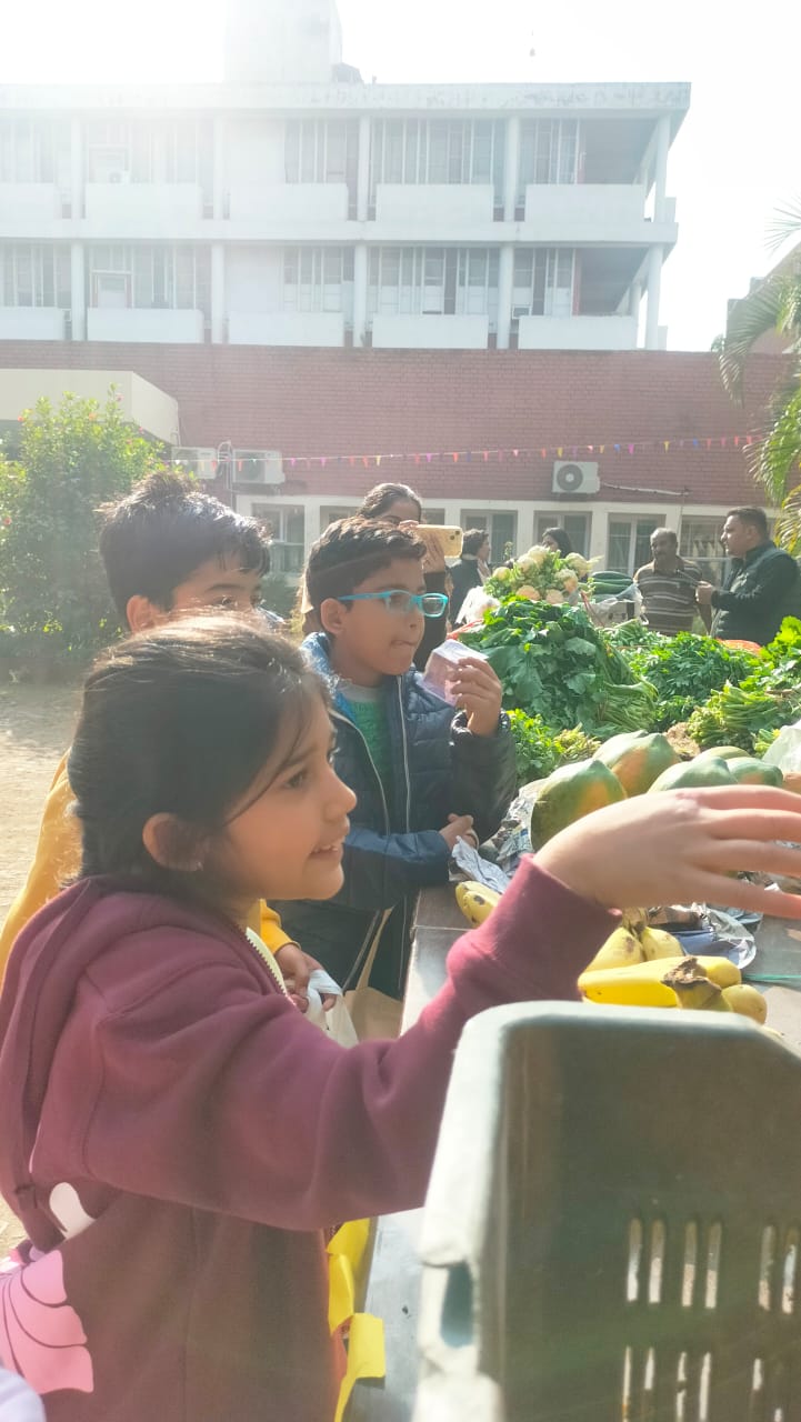 The school conducted a meaningful Healthy Basket Day activity where a vegetable vendor was invited with a variety of fresh vegetables and fruits, giving students a real market experience. Children from Classes 1 to 5 brought money, checked the rate list, and made purchases independently, learning practical money management. Kindergarten students, accompanied by parents, explored the names, colours, and shapes of different fruits and vegetables. The activity encouraged experiential learning, confidence, and the inculcation of good eating habits, ensuring joyful participation from all students.